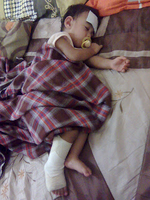 Dua hari lepas, Selasa-saya dikejutkan aisya demam panas diikuti keadaannya yang 'tersentak-sentak'.Melihatkan keadaannya yang semakin baik pada malam dan pagi, saya memutuskan untuk bekerja.Tapi jam 9.40pagi semalam, Rabu- saya sekali lagi dikejutkan dengan panggilan telefon mengatakan kaki kanan aisya 'nampak lain' dan dia langsung xboleh berpijak/berdiri.Menangis sejak bangun pagi.Hanya mahu berdukung/diriba.Terdengar suara lolongan tangisan anak kecil itu di corong telefon.Aduh..sekali lagi saya berkejar balik untuk melihat keadaannya.Sebaik sampai saya lihat anak saya masih lagi tersedu-sedu menangis (mata pun dah bengkak).Bila dilihat kaki yang dikatakan sakit itu nampak urat2 biru timbul dan bengkak.Mahu memegang kakinya saja dia dah menangis.Saya terus mengangkatnya dan kami ke klinik.Mulanya saya mahu ke klinik kerajaan saja tapi memikirkan pasti menunggu lama dan anak saya yang masih menangis kesakitan, saya menuju ke klinik swasta sahaja.Di sana doc memeriksa dan beliau mengesahkan agar kaki aisya perlu dixray.Doc tersebut hanya membalut kaki aisya dengan bandage dan memberi ubat tahan sakit.Sudahnya hospital juga tempat kami :( Setelah diberikan ubat tahan sakit dan melihat dia lena, saya putuskan untuk ke hospital petang-menunggu babahnya habis kerja dan saya sendiri bergegas kembali kepejabat kerana masih ada kerja penting yang perlu diselesaikan.Namun setiap setengah jam saya pasti menelefon bertanyakan keadaan aisya dan jawapan yang saya terima dia ok dan masih lena tidur cuma sesekali keadaannya seperti menahan kesakitan.Tengahari, sewaktu saya sedang berfikir untuk mencari seseorang bagi bertanyakan pendapat, tiba-tiba saya terima panggilan dari ina ibu nabila.Satu kebetulan yang baik.Pada ina saya ceritakan segalanya dan pendapat ina saya perlu segera kehospital.Bimbang keadaan itu berkait dengan 'tersentak-sentak' aisya.Aduh, mengapa saya tidak terfikir tentang itu?Secara automatik, mudah sekali airmata ini mengalir.Takut?Bimbang?Semuanya bercampur baur.Terima kasih ina kerana mengingatkan ayu.